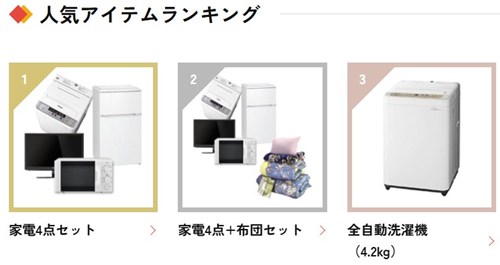 人気アイテムランキングの1位は「生活家電セット」となっています。